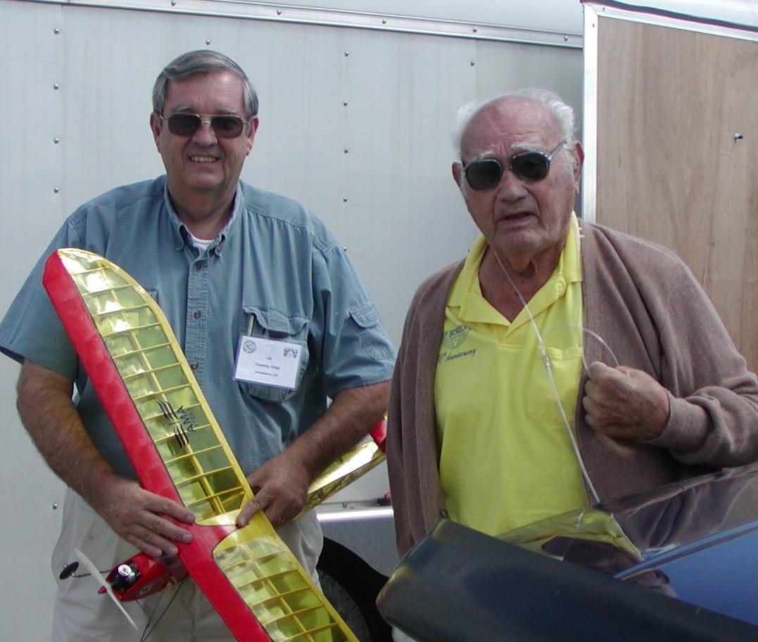 Tommy Gray with Modeling Legend Sal Taibi. Sal was signing the wing of the Powerhouse Tommy is holding (which Sal designed in 1939). Tommy's 1/2 scale version is for 1/2A Texaco |