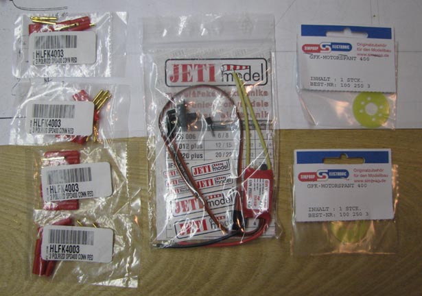 polarized connectors, (2) a JESI 12 Amp ESC, and (3) two motor mount wafers.