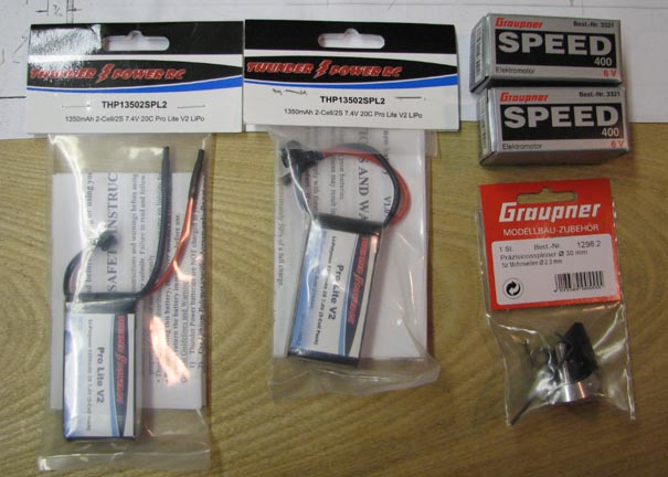 are: (1) two Pro Lite 1350 mAh 7.4 volt battery packs, (2) two 6 volt Speed