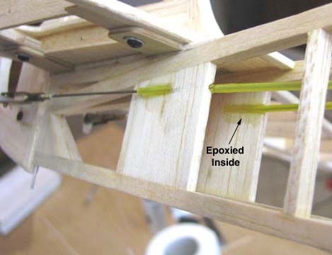 the clean exit of the 1/32" push rod out of the fuselage's side at just the