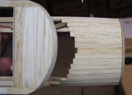 The aft edge of the strip planking was trimmed