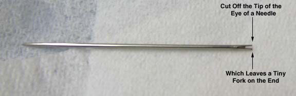 needle with the tip of the eye cut off as shown below. When he puts a drop