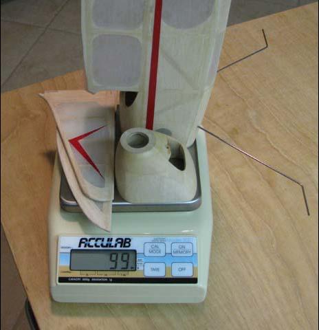 A two ounce Klass Kote mix consisting of 1/2 oz Clear Epoxy, 1/2 oz Satin Catalyst, and 1 oz of Reducer was used to air brush one thin coat on the fuselage, cowl, fin and rudder. It is note worthy to point out that only about half of the mix was actually used in this application. After the Klass Kote had time to cured overnight, this morning the paint fixtures were removed and the fuselage, cowl, fin, and rudder were again weighed together as shown below.