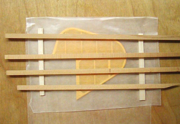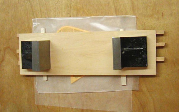 TandyNow pin down to a flat surf and let it cure out 4-5 days before useMikeI received the above e-mail from Mike concerning rudder surface warping. I checked the rudder surface for warps after the first coat of dope had dried and there was none yet. So I put a second coat of 50/50 dope on the rudder and let it dry to the touch for about 30 minutes. I placed the doped rudder on a piece of wax paper and folded the wax paper over on top of the rudder. I placed 1/8" sheet balsa on either end of the 1/8" thick rudder and placed four 1/4" square spruce strips on the top layer of wax paper as shown below. Notice the second strip from the top is resting over the rudder's main spar.Then I place a piece of sheet spruce on top of the four strips and weighted the whole thing down with two square steel block as shown below. I will leave this for five days while the two coats of dope on the yellow tissue cure out as Mike suggested....................Tandy