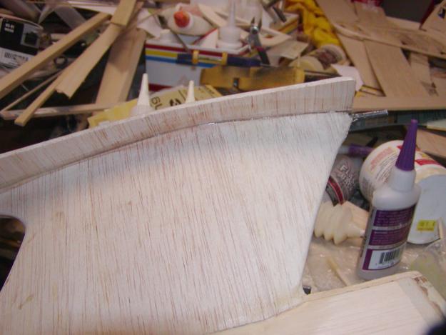 Now, I am finishing up the pylon. In the next picture you can see that I have it finished in and I have put a little balsa putty between the sheeting and the fuselage side, which when sanded will be virtually invisible.