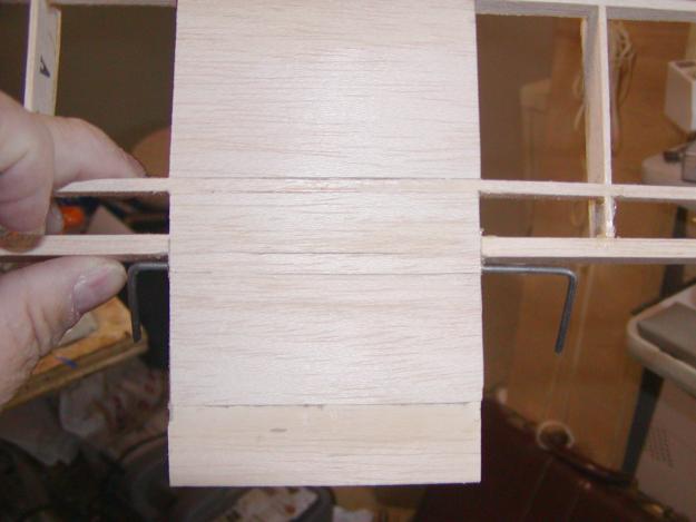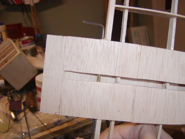 You can see the brass tubing showing in the rudder slot. To mount it I took a Dremel tool and cut a groove through each of the ribs so it could be inset 1/2 way through exactly in the center of the space from top to bottom. Later I drilled the holes in the elevators so that the wire could be inserted into them after hinging.