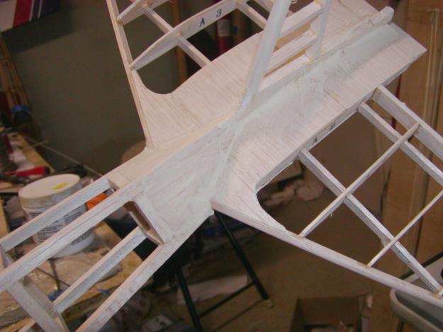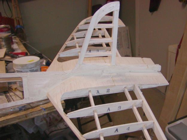 Next, I glued everything in place and cut out some 1/8" filler pieces to fill the area between the front of the stab and the fuselage. Once I had it filled and mounted, I glued in the rudder. After everything was glued in place, I added a little balsa colored filler, which will be sanded away when dry leaving a nice smooth joint ready for covering.