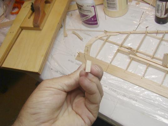 Next, using my balsa stripper, I stripped out some pieces of 1/4" the exact same height of the ribs, at the location where I wanted the hinge points for the elevators to be.