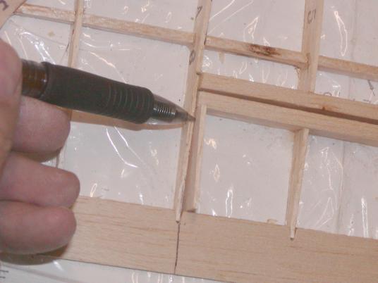 .Using some scrap 1/16" balsa, I made the two end ribs to finish out the elevator by inserting the piece into position and using the top of the adjacent rib, I marked the shape.
