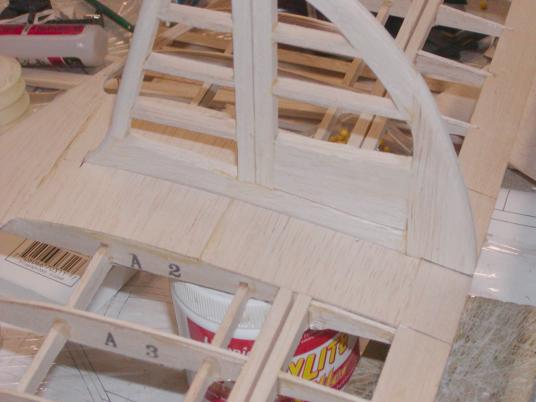 First, however, I wanted to add some sheeting to the center section of the stab in preparation for mounting of the stab. The sheeting will also make it easier to attach the unit to the fuselage, and give it a little more strength. As you can see in the picture below, I covered the top of the stab with some 1/16 soft balsa and tapered it into the front to add a little strength to the leading edge and to make it look a little neater. The leading edge is not very large and needs all the help it can get.