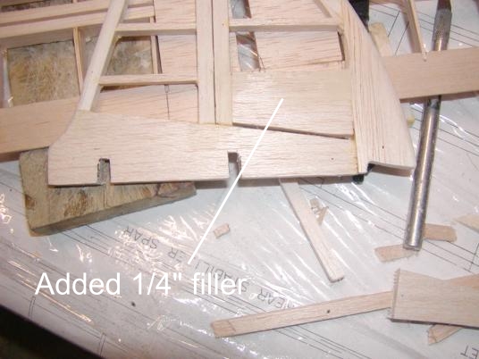 In the original Gas Bird, the rudder simply was glued to the top of the 1/4" longeron on the top of the fuselage, and filled in with some sheet balsa. On mine, I am going to do it in a little more substantial fashion, using a method I use on all my planes that have the rudder on top if the stab.