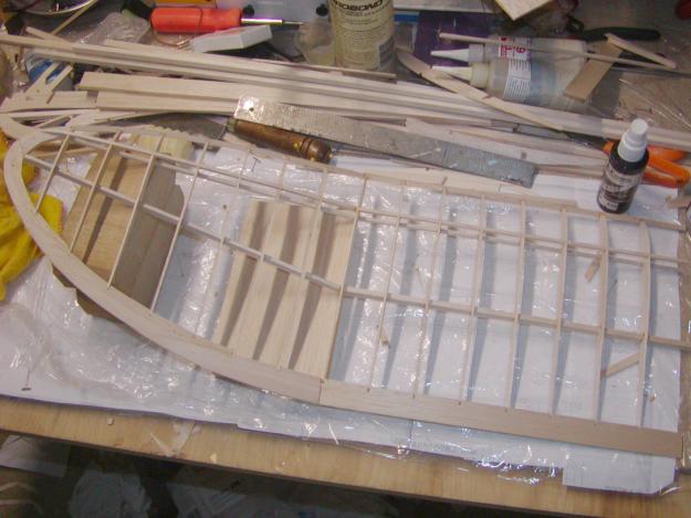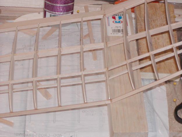 Here it is with the first piece of sheeting in place and glued. you can see the good tight joint at the leading edge I obtained by pre-fitting the sheet before gluing it on.