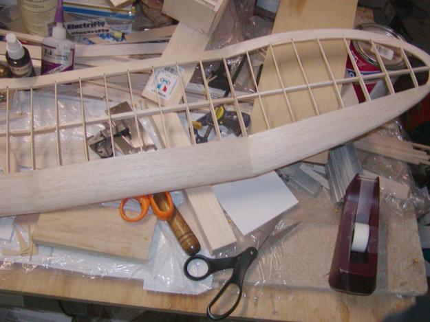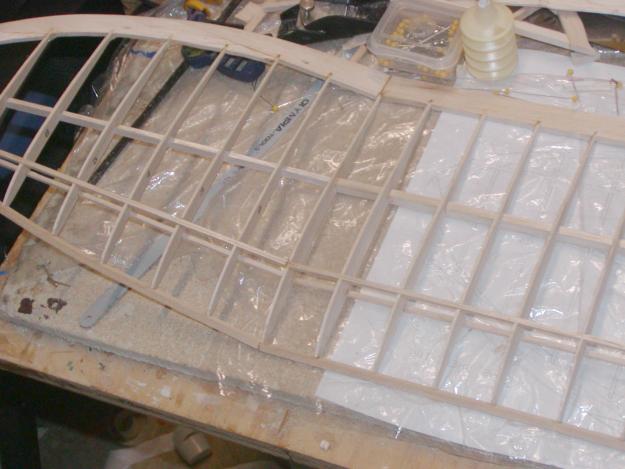 I completed the wing centers by adding the sheeting to the other side, attempting to keep a tight joint where they met in the center of the wing.