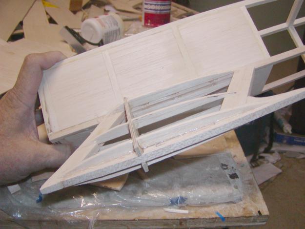 I put some slow, thick CA glue on one side of the structure and held the sheet panel in place until the glue setup, which only took about 30-45 seconds. I then cut out the excess balsa and securely glued it all the way around for a final fit. Once dry and roughed out, I did the same for the other side.