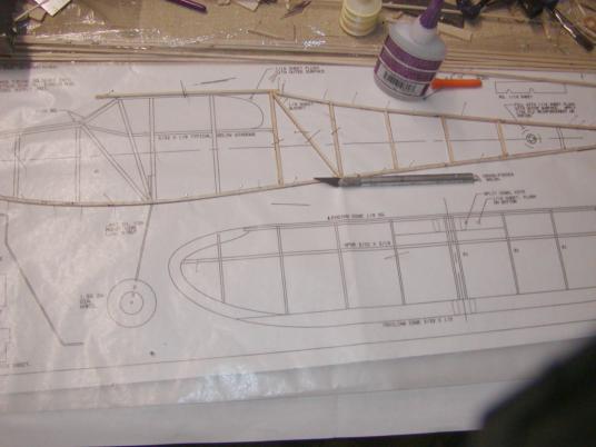 I started the build by framing up the fuselage. I had decided to try to use 3/32" sticks instead of the 1/8 recommended on the plans, in an effort to try and save weight. About that time, Mike McIntyre sent me an email and in it he stated "try to use 3/32"! This was my confirmation. I went to an area hobby shop as my usual hardware store had let their balsa assortment get down a little and though I bought all the sticks they had 6 months earlier, the had not restocked. There are three shops within 100 miles of where I am but none closer than 70 miles so getting supplies sometimes is a hassle and the Internet is my usual source of materials. To save time on this as it is short I drove down to one of the shops and for some wood.