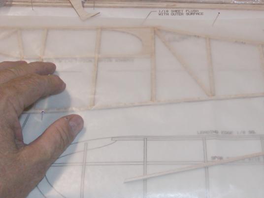 I want to mention here that when I say "Pin" down the wood I do NOT mean to pin through the wood. I NEVER put a pin through the wood on these small sticks as it will lead to them breaking later one. What I do is to cross pins on both sides of the stick in the fashion I show below. it holds the wood to the plans and will not damage the wood.