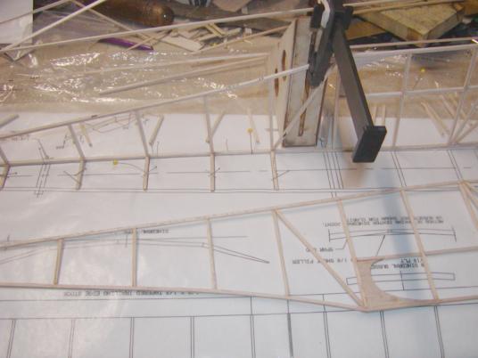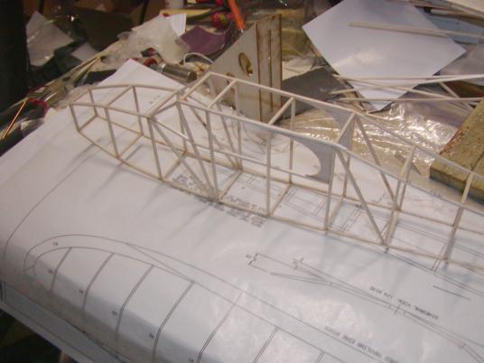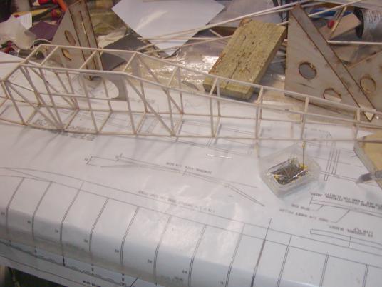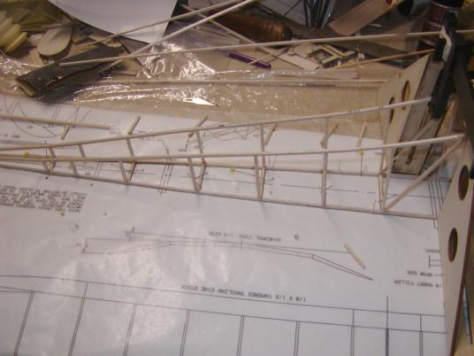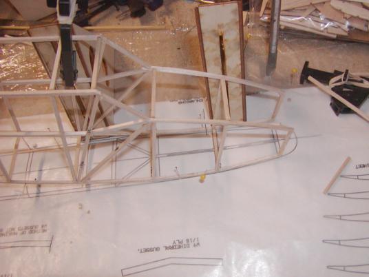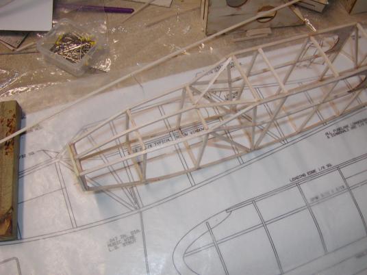Next, I placed the right side on the plans pinning it down and gluing it to the already in place, cross pieces. I did not put the front cross pieces in yet, as the fuselage is curved and I will work it from the rear, which has the longest straight pieces. This allows me to get a lot of it glued before moving it from the plans.