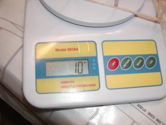 O.K....here we go. This is the acid test for now. According to my scale (which by the way, I took to the regional airport where my son works as an IA/AP and compared with their FAA approved scale, and found it to be right on), we weigh a grand total...Drum Roll Please....... .35 (that's "Point" 35 ounces).