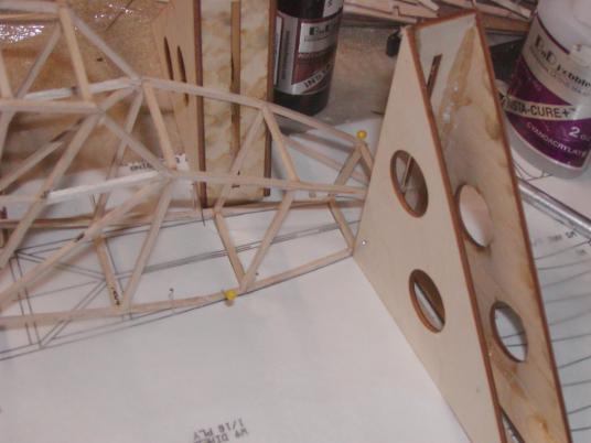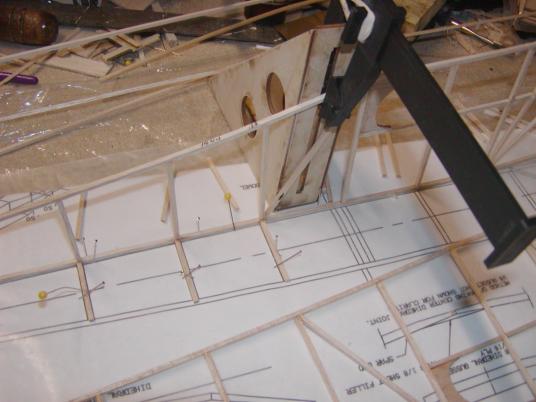 Here you can see I have cut the cross pieces (top and bottom exactly the same length) and laid them out at each station ready to attach. I pinned them to the plan after applying a little glue and using the square, made sure everything was kosher.