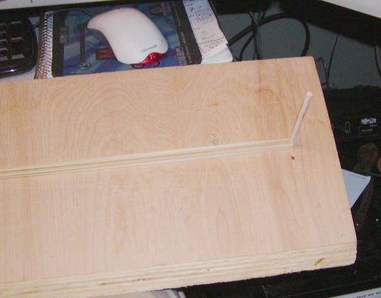 I made up a winding "jig" by taking a scrap of plywood and drilling two holes in it for some dowel cutoff pegs. In the picture below you can see what I mean I first put the pegs 20" apart, but later changed it to 30" as I will explain later.