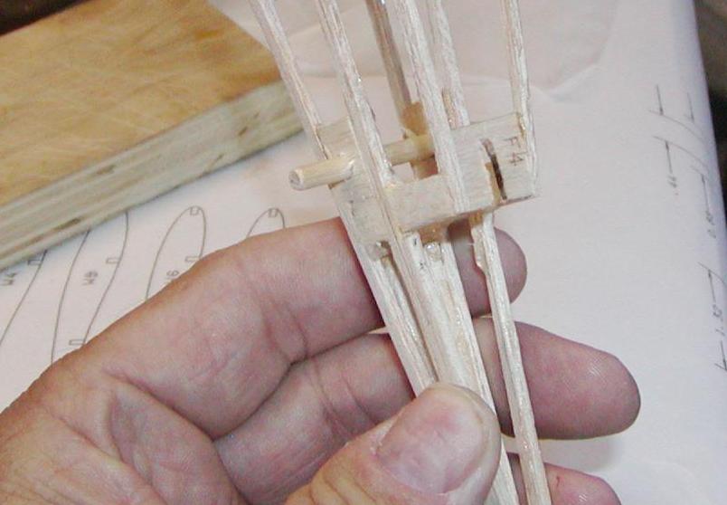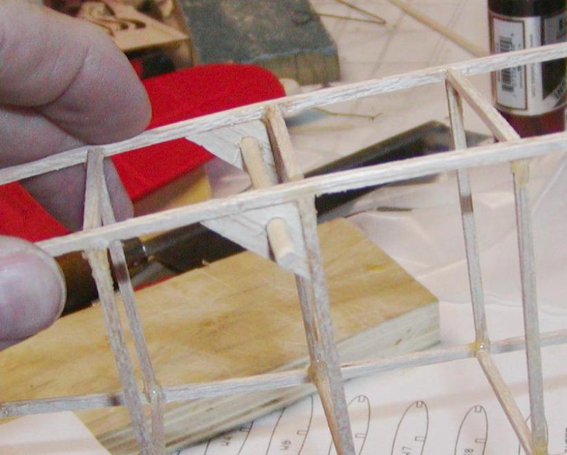 Next, I added the wing and stab hold-down dowels. I put in some small balsa gussets and drilled them to hold the little pieces of 1/8 hardwood dowels.