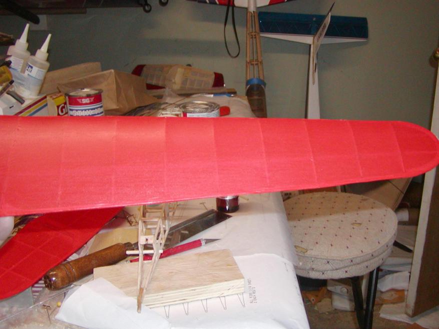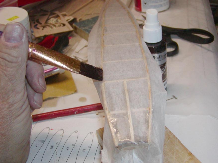 Allow me to inject one thing here first. When covering Polyspan, silk, silkspan, tissue, or any covering that is "doped" on, you should put at least a couple of coats of nitrate dope on the wood first to seal it, sanding in between coats. I always sand in between the coats to remove any balsa fuzz, and give a smooth surface for the covering to adhere to. Then if it needs it, I will add another coat or two of the 50-50 thinned dope afterward.