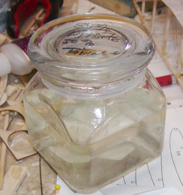 I use a 50-50 mixture of Sig nitrate dope and thinner to apply the Polyspan and to seal it. One word of caution here. Sig says that its nitrate does not shrink, but it will to a certain degree, so be careful where and how you use it. After having seen the video that Larry Davidson puts out on covering with Polyspan, I saw his little jars he used for the dope and tried them for myself. They work great, and the dope doesn't seem to harm the plastic seals at all. The one in the picture below is over a year old and has been used a lot and still seals off and works as well as it did the first day I used it. I take a permanent Sharpie marker, and write a description of what is in the jars on the lid. I have some with un-thinned dope, and some with 50-50. These little jars work great for me. I got mine at the local Wal-Mart store in the "Housewares" section.