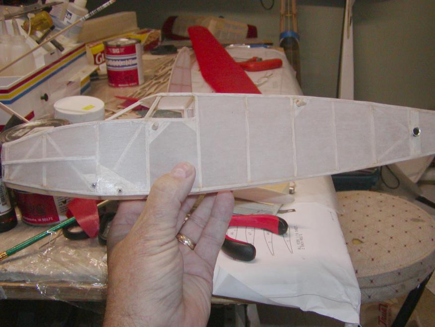 You may have noticed that I also at this point, have added the hold-down dowels, and inserted the rubber peg (made from 1/4" aluminum tubing), and cut out the section of covering just in front of the peg to allow access to the rubber motor for mounting.