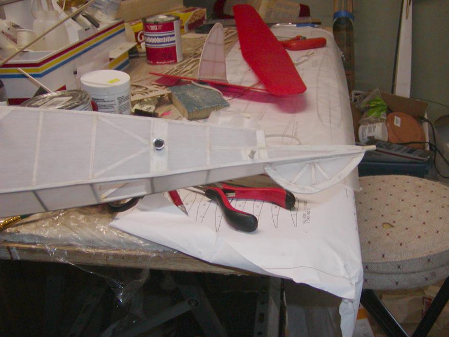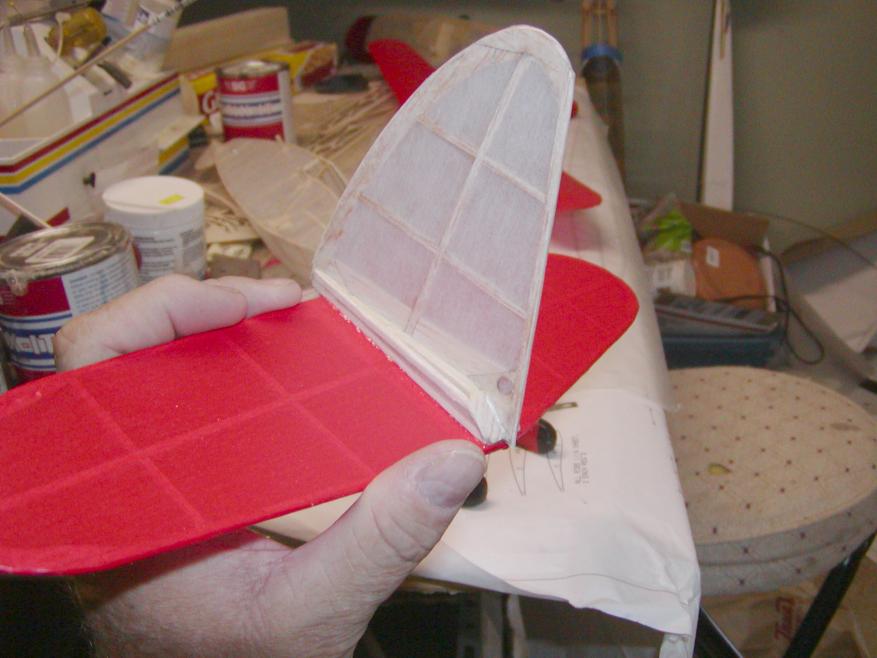 In the next picture you can see that I have attached the rudder to the covered stabilizer. I cut back a little of the tissue covering so that the rudder could be glued onto the bare wood of the stab.