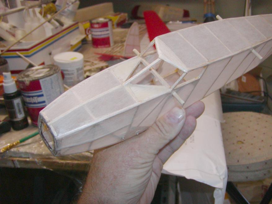 The front of the fuselage showing the top of the structure is shown here. As you can see, the Polyspan makes a very nice covering and it strong!!
