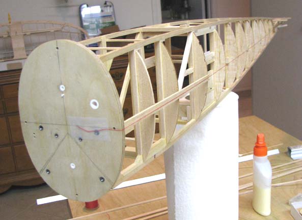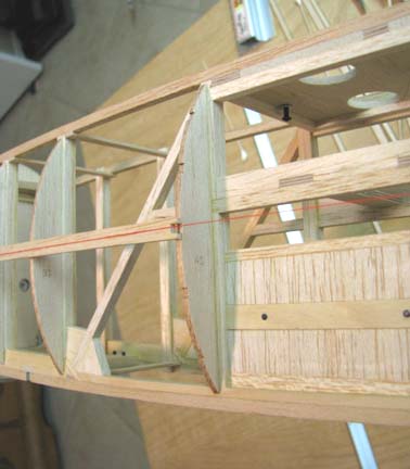 bulkhead pieces glued on. I used the red thread to check the alignment of
