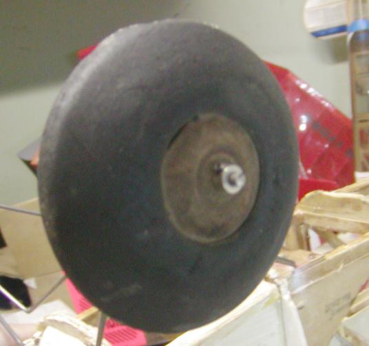 I will clean them up and paint the wooden rims once everything is done. Here is a picture of one of them. I already have them installed on the new landing gear. The gear wire is 1/8" and the holes in the wheels were very worn, so I drilled them out to 5/32 and installed a brass tubing spacer in them, so they now fit the new gear nicely.