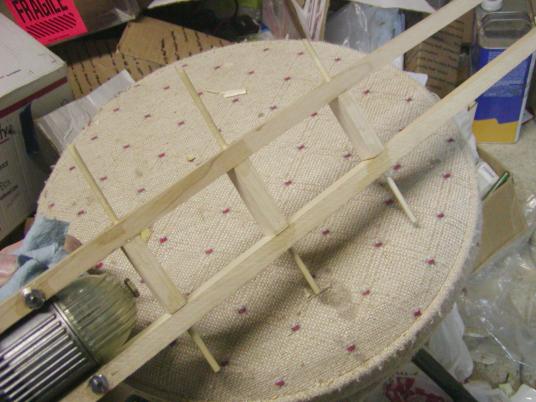 As you can see I tacked the blind nuts to the mounts after having seated them, with some glue to keep them in place. Next here is a picture of the cross pieces and dowels, assembled and waiting for the glue to dry.